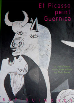 Ce que l'on peut reprocher à cet album, par ailleurs bien illustré et bien présenté, est son parisianisme légèrement snob, mélange de fausse bonhomie (on prend les enfants pour des imbéciles), et d'allusions de chapelles. Un exemple en est le titre. On ne pouvait écrire simplement : Picasso peint Guernica, il fallait ajouter le :et. Bien sûr il a été prémédité. Il s'agissait de suggérer que Guernica est venu après bien des hésitations, mais n'est-ce pas le cas de toutes les oeuvres. Plus graves sont les désinformations idéologiques qui pullulent dans les explications et qui dénotent la présence de Médusa, le gauchisme bcbg des bobos. Par exemple nulle allusion n'est faite aux origines chrétiennes de l'oeuvre, du Beato de Liebana (Apocalypse mozarabique) exposée à l'orangerie à l'époque de la création du tableau, grâce aux soins de Sabartès, le biographe de Picasso, jusqu'au retable d'Issenheim qui démontre que le tableau dont la structure en triptyque est révélatrice, est en réalité un immense crucifixion. Tous les ouvrages récents mettent l'accent sur cette signification religieuse, soigneusement occultée par les communistes et les gauchistes. Le Musée Picasso, lui a consacré une magnifique exposition : Corps crucifiés qui démontre la genèse chrétienne du tableau.
